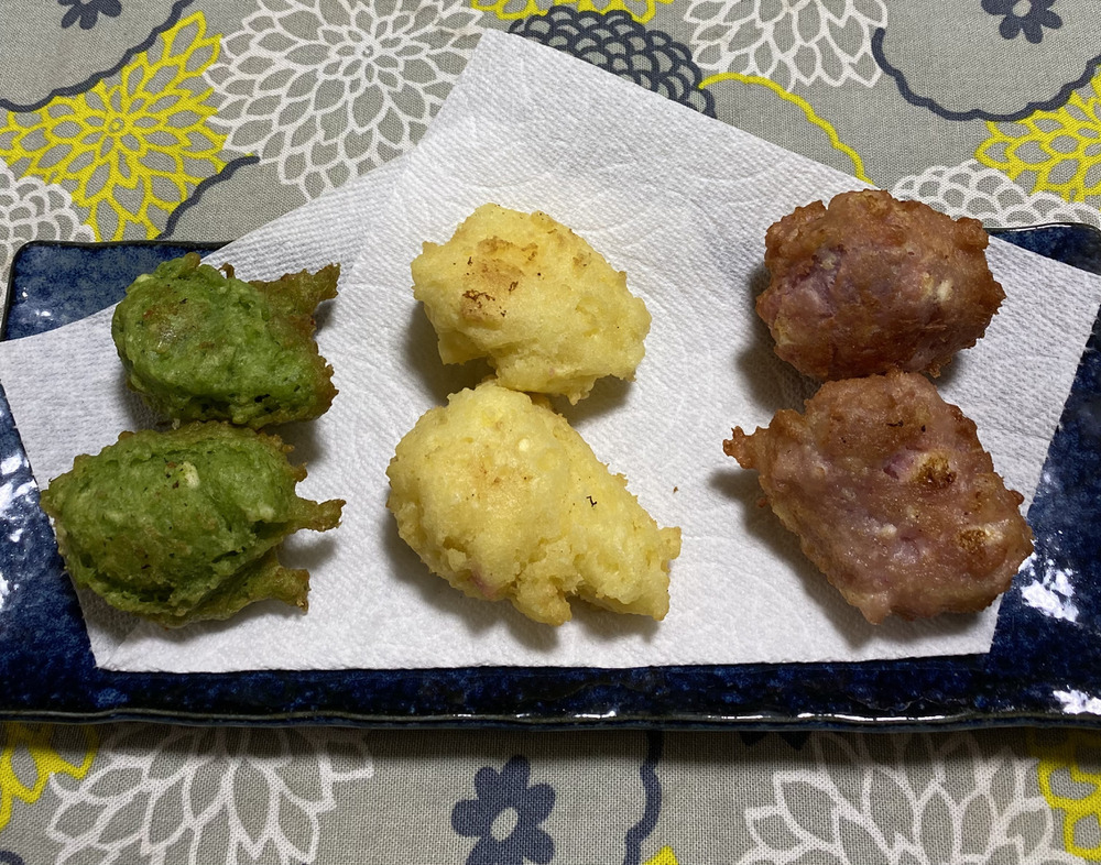 ホットケーキミックス 豆腐卵で生地を作り、①ほうれん草ペースト ②そのまま ③紅芯大根のすりおろし 牛乳で硬さを調整して スプーンで掬ってドロップドーナツに