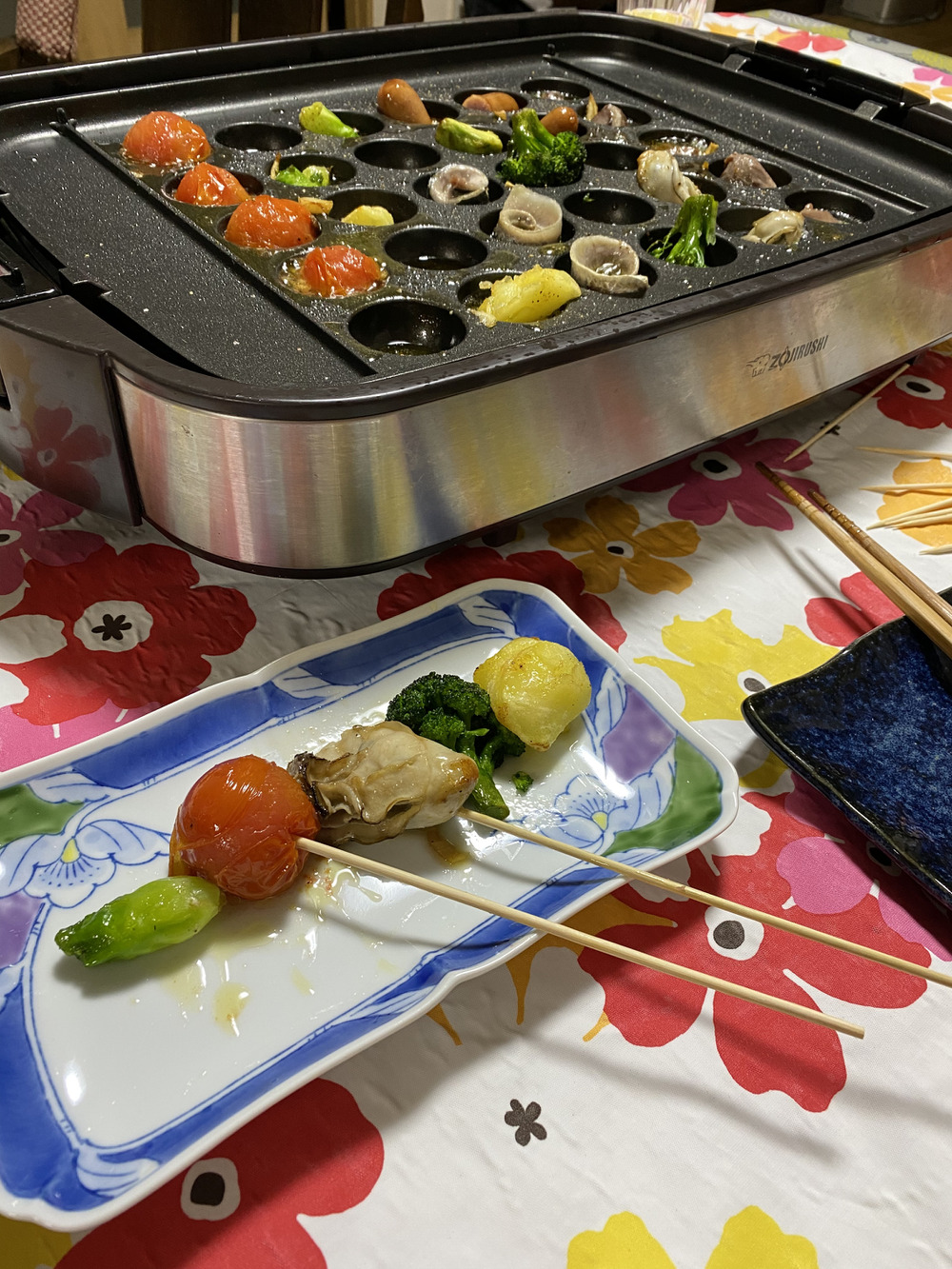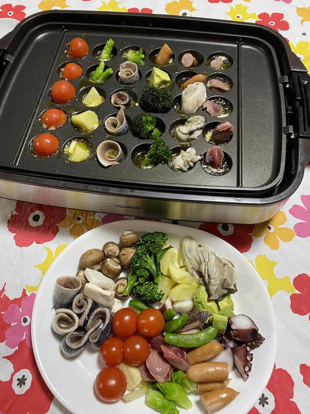 たこ焼きプレートにニンニク アンチョビ オリーブオイルを入れて ブロッコリーや子持ち高菜 ミニトマト イワシ たこ 牡蠣 砂ずり などなどでアヒージョにしました。ワインも 食も進みます。今日も満腹!