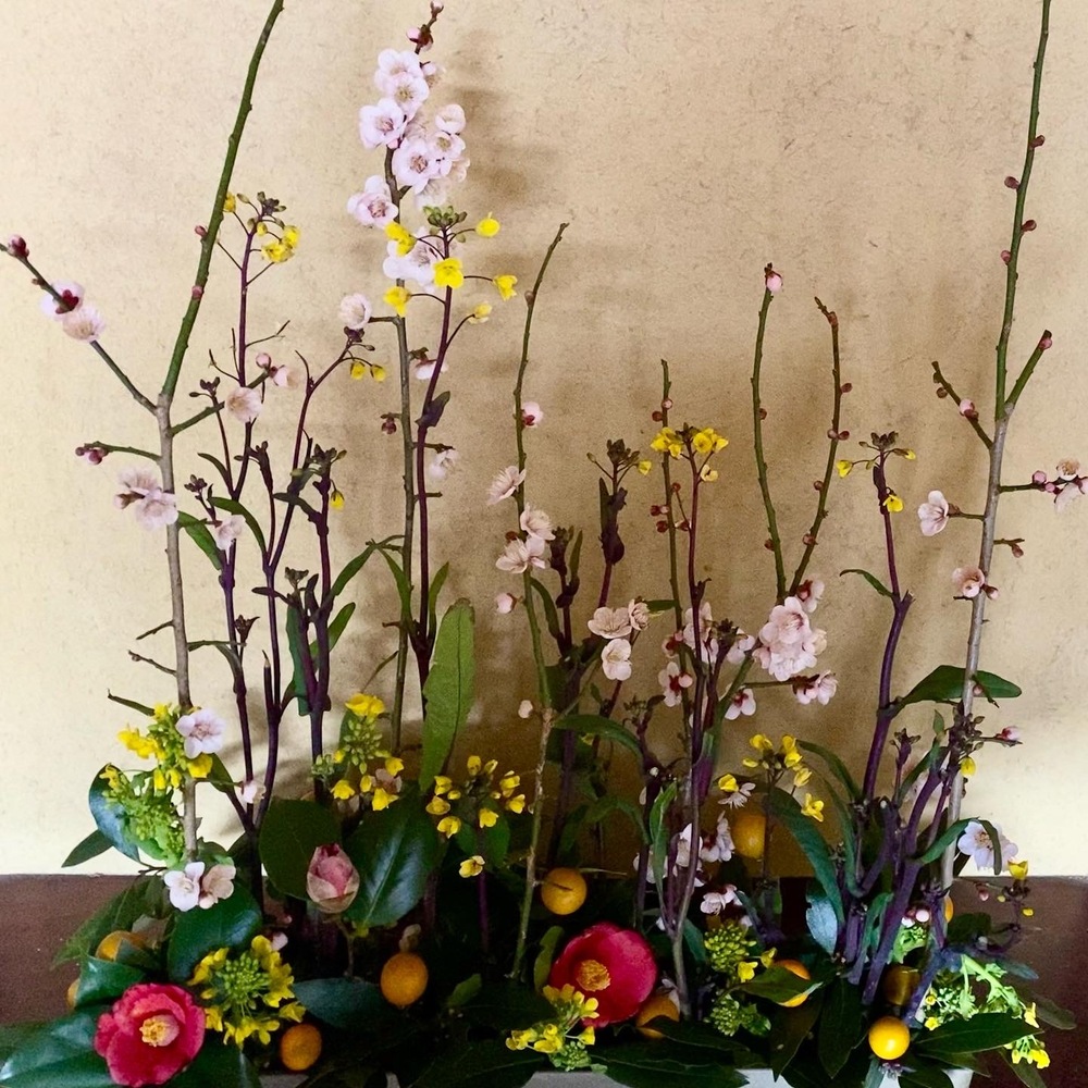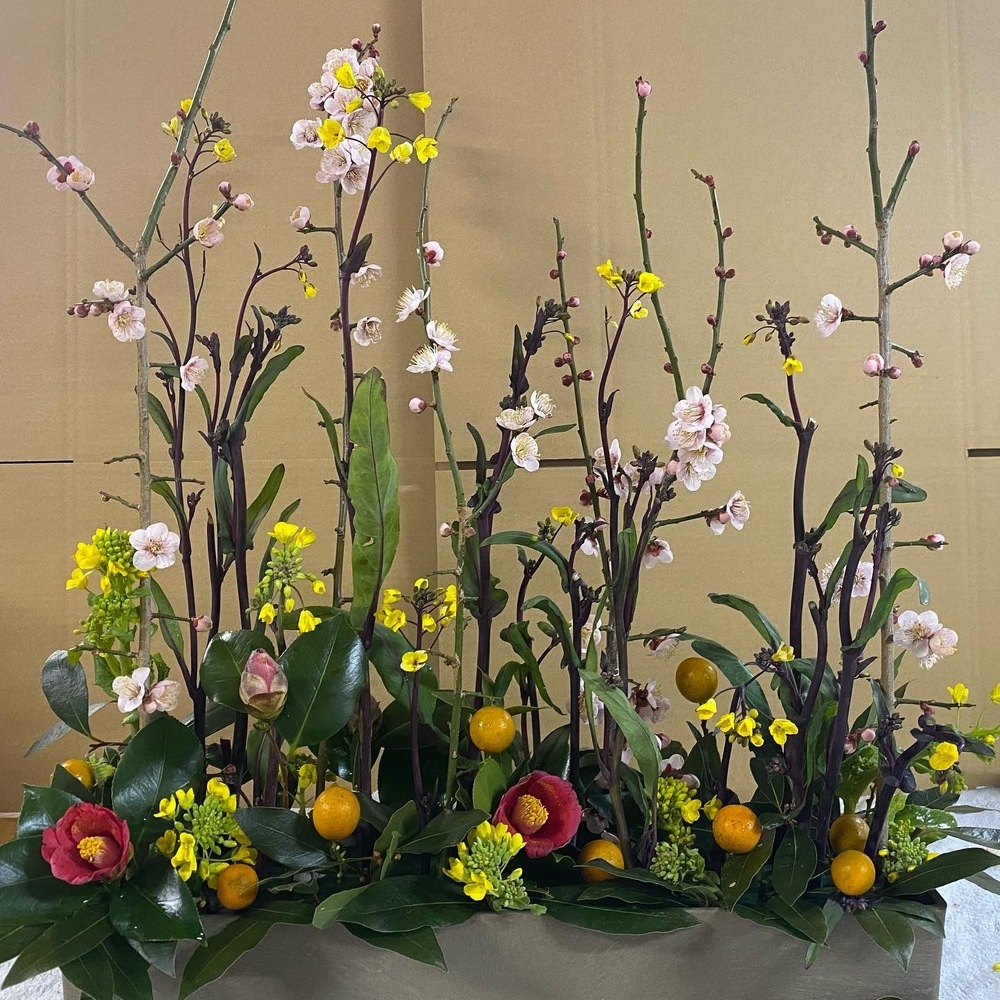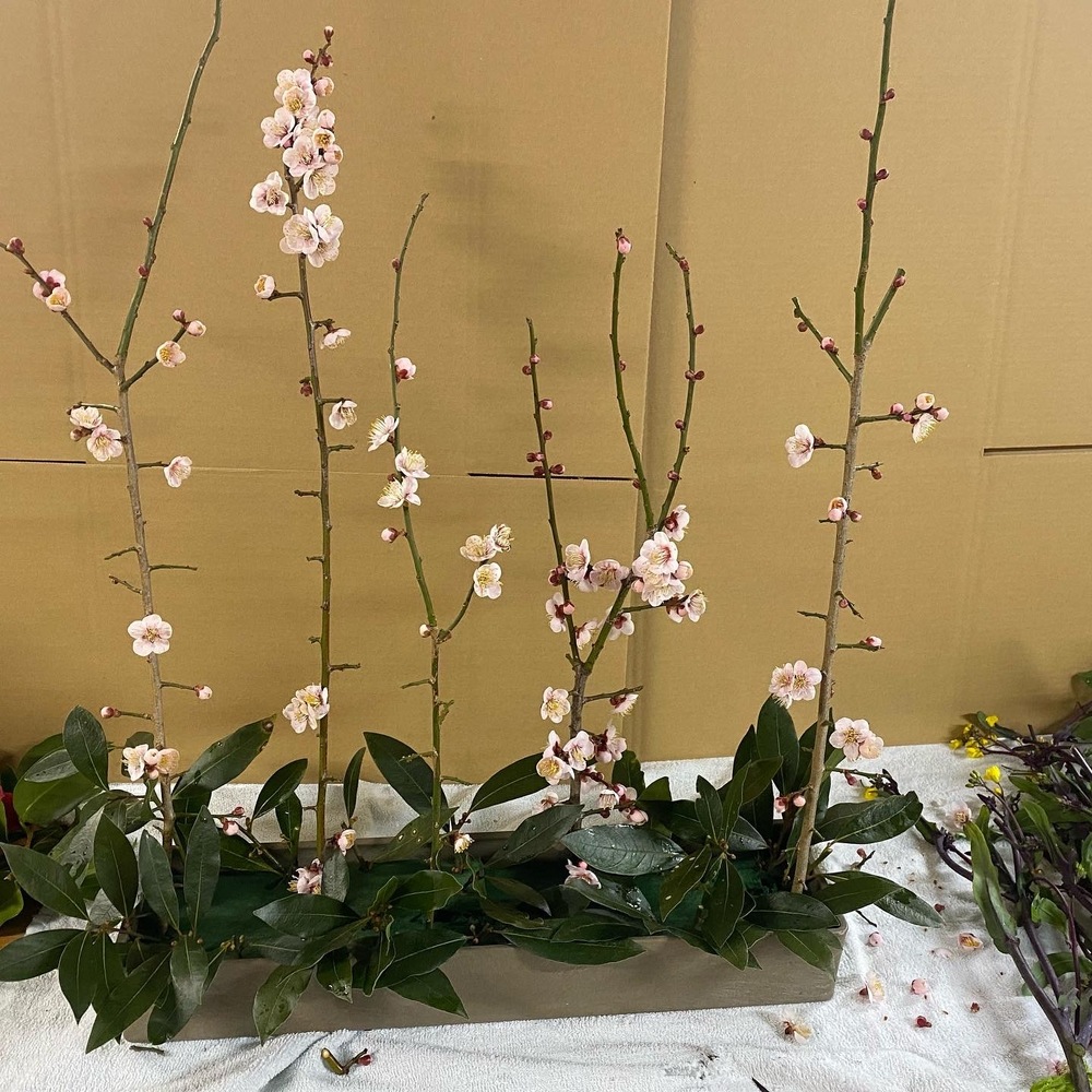 紅菜苔や菜花 アスパラ菜をお花のように使ってくださってる投稿をいただいて いいないいな と思い ちょっと真似してみました。材料はファームの周りの梅の花 椿 きんかん 月桂樹 ちょっと伸びてしまった紅菜苔 花開いた菜花