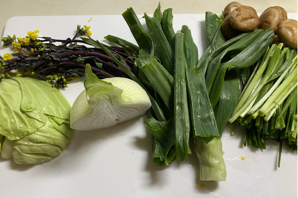 新玉ねぎの実と葉 キャベツ 紅菜苔ニラ しいたけ エビ 豚ミンチで餃子を作りました。