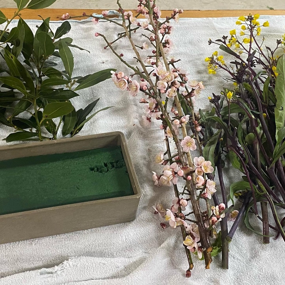 紅菜苔や菜花 アスパラ菜をお花のように使ってくださってる投稿をいただいて いいないいな と思い ちょっと真似してみました。材料はファームの周りの梅の花 椿 きんかん 月桂樹 ちょっと伸びてしまった紅菜苔 花開いた菜花