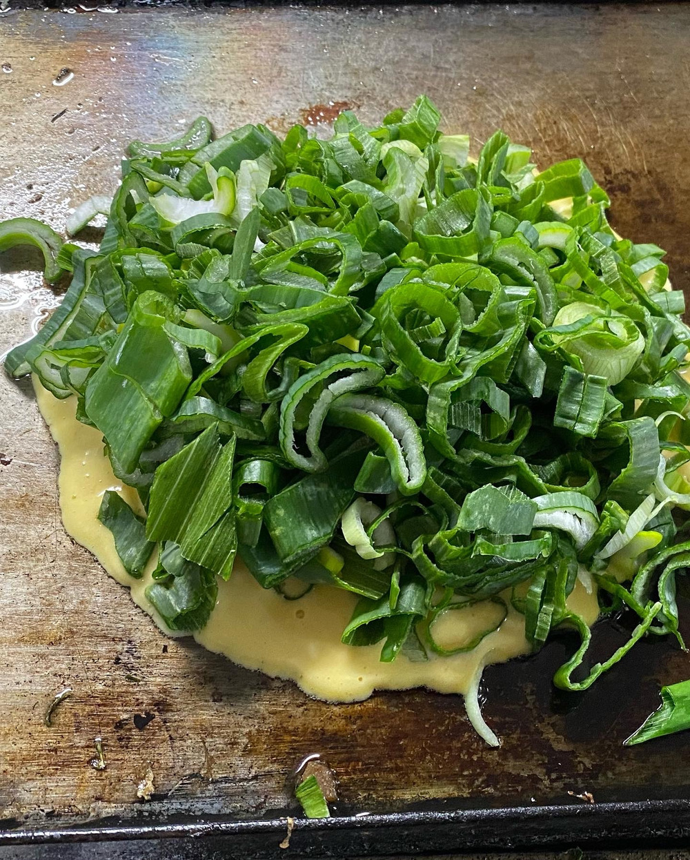 新玉ねぎの葉は ふつうのねぎより 甘くて歯ごたえもいいのです。ほっこりファームではこの季節のお好み焼きには 新玉ねぎの葉を使います。ふうふうあったまるおうちごはんです。