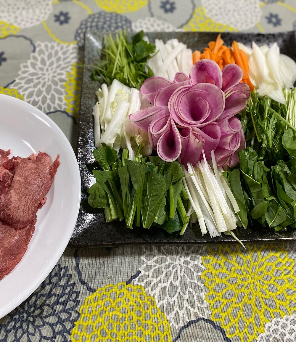 真ん中は紅芯大根の花びら 小松菜 スイスチャード 水菜 白菜 大根 にんじん 玉ねぎ