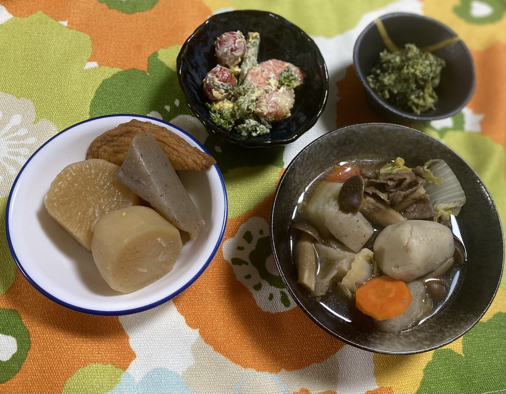 大根とかぶらの葉の擦り和え ちょっと味噌を入れすぎたので白菜も入れたら 水っぽくなってしまいました。けっこう 水気切ったのですが、白菜は向きませんでした。おばあちゃんは上手に作っていたのになあ。次リベンジです。大根の煮物 ブロッコリーのサラダでした。