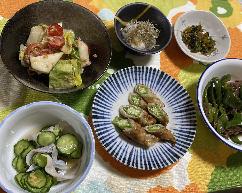 今日出荷残りの野菜がたくさんあったので エイヤーッと料理しました。大根葉とちりめんじゃこの甘辛煮(実はじゃこも自家製です。)大根おろし ピーマンと牛肉の炒り煮 オクラの豚肉包み(これは 前にお客様に教えていただいたもの) きゅうり酢の物 ロメインレタス ラティーナ フルティカブロッコリーのサラダ (安定の美味しさ) 大根おろしはまだ少し辛い感じでした。今日お送りしたお客様ごめんなさい🙇♀️でも野菜いっぱいで食べすぎても平気な感じがいいです。