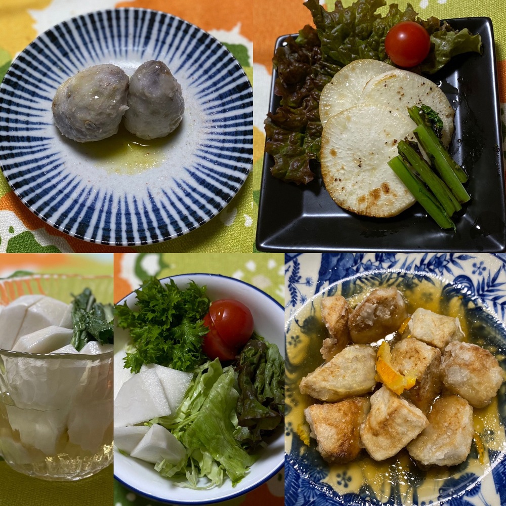 里芋のグリル この頃よく作ります。ほっこり焼きあがったら 塩をパラパラ オリーブオイルもあいます。出汁につけて置いた里芋に片栗粉をまぶしから揚げに 薄味のつゆに浸してゆずを少し。かぶらラティーナは 甘酢漬け オリーブオイル焼き 葉の部分 茎もおいしい サラダには キャベツ わさび菜 レッドファイヤ~レタス フルティカも一緒に ドレッシングは大根ドレッシングです。今の旬いただいています。