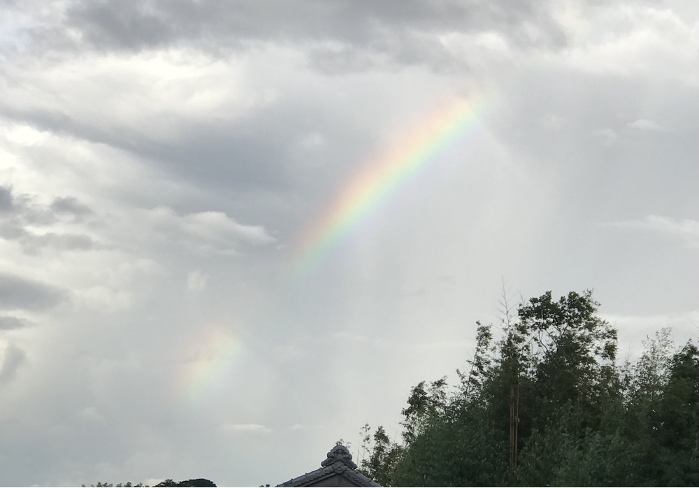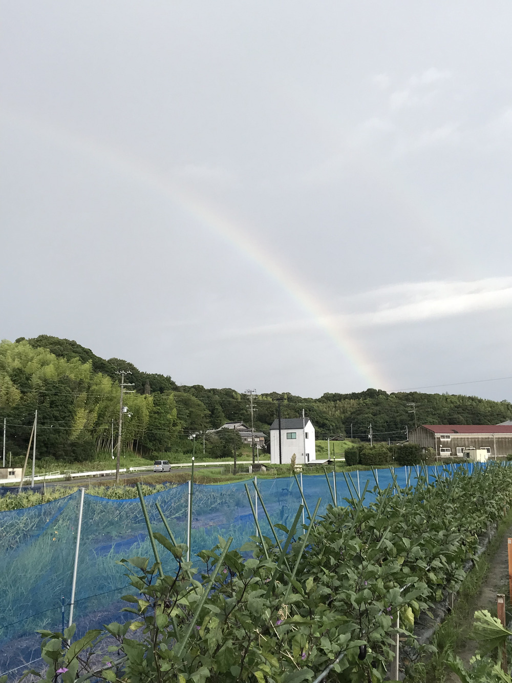 茄子の向こう側の空に虹🌈がかかっていました。良く見ると2重の虹 何かいいことあるような 嬉しい😃😆😊‼️