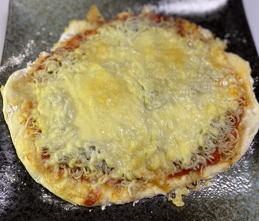 サンマルツアーノをつかってトマトソースを作り、淡路島特産のシラスをつかってシラスピザ