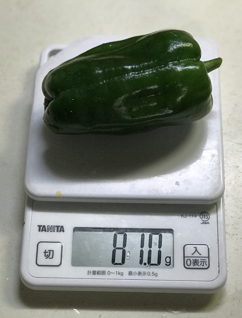 なんと1個80グラム越えピーマンがとれました。ピーマンの種類は「さらら」というもともと肉厚で大きなピーマンなのですが、ここまで大きいのは珍しいように思います。そこで定番の肉詰めを作りました。肉の中にも七宝が入ってボリュームたっぷりに仕上がりました。肝心のお味ですが ピーマンの歯応えもアクセントで 美味しくいただきました。今晩は夏野菜たっぷりの夕食でした。