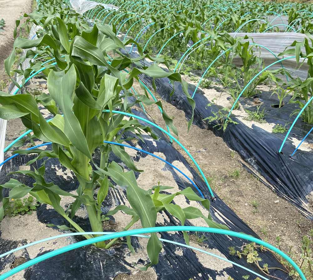 まだまだ小さかったとうもろこしがトンネルよりも大きくなりました!この苗木一本につき一つのとうもろこしにする事で大きくて甘いとうもろこしになります。もう一月くらいで大きな甘いとうもろこしができると思います。