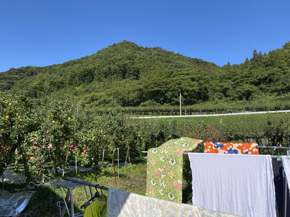久しぶりのお天気で、東京から泊まりがけで収穫を手伝いに来てくれた息子達の布団等を天日干し😊