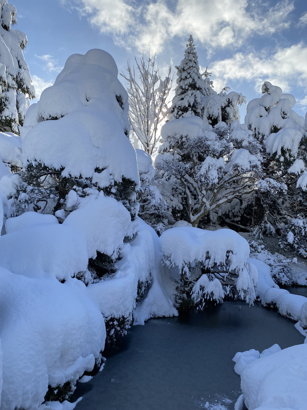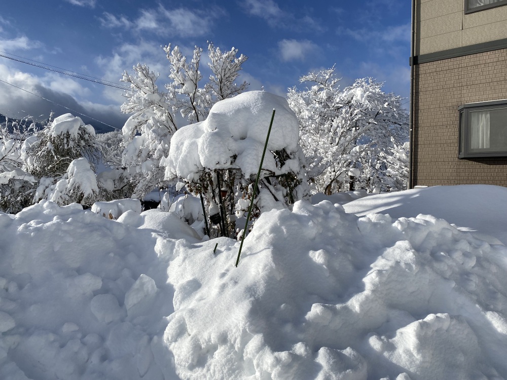 老朽化していた薔薇のアーチは壊れてしまい、母家の庭の松の木にも雪が覆い被さっています。
