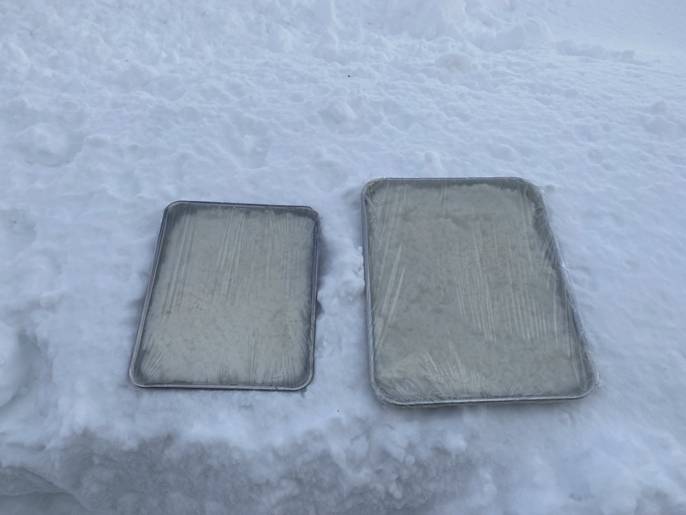 餅米二合とうるち米5合を一升の量の水で炊き上げ、潰してからバットへのばして、凍らせるために外へ!
