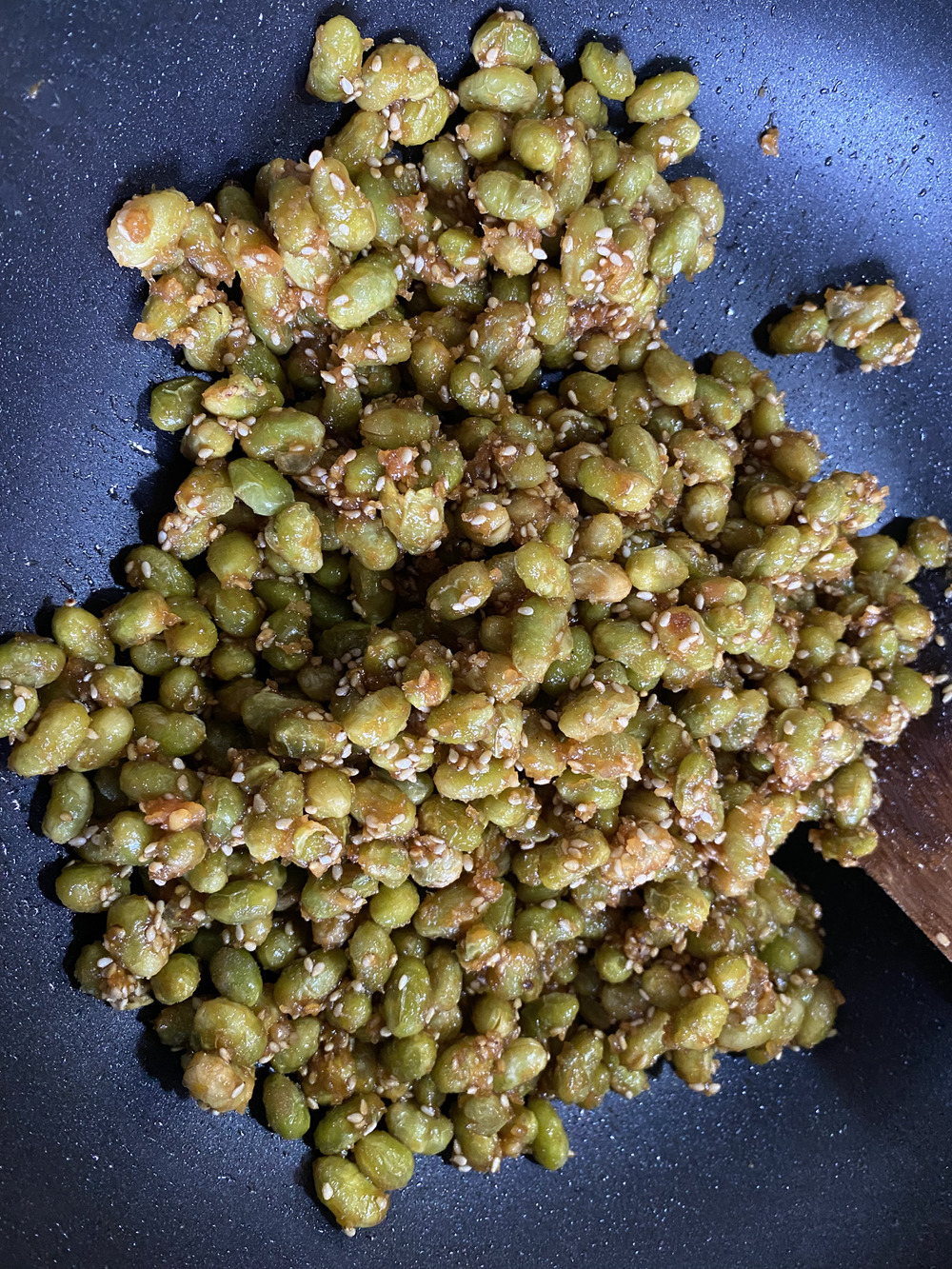 一晩水につけた大豆をよく水をきって、油で素揚げします。そのあと、砂糖と味噌、胡麻をからめて出来上がりです。ご飯のお供にも😊