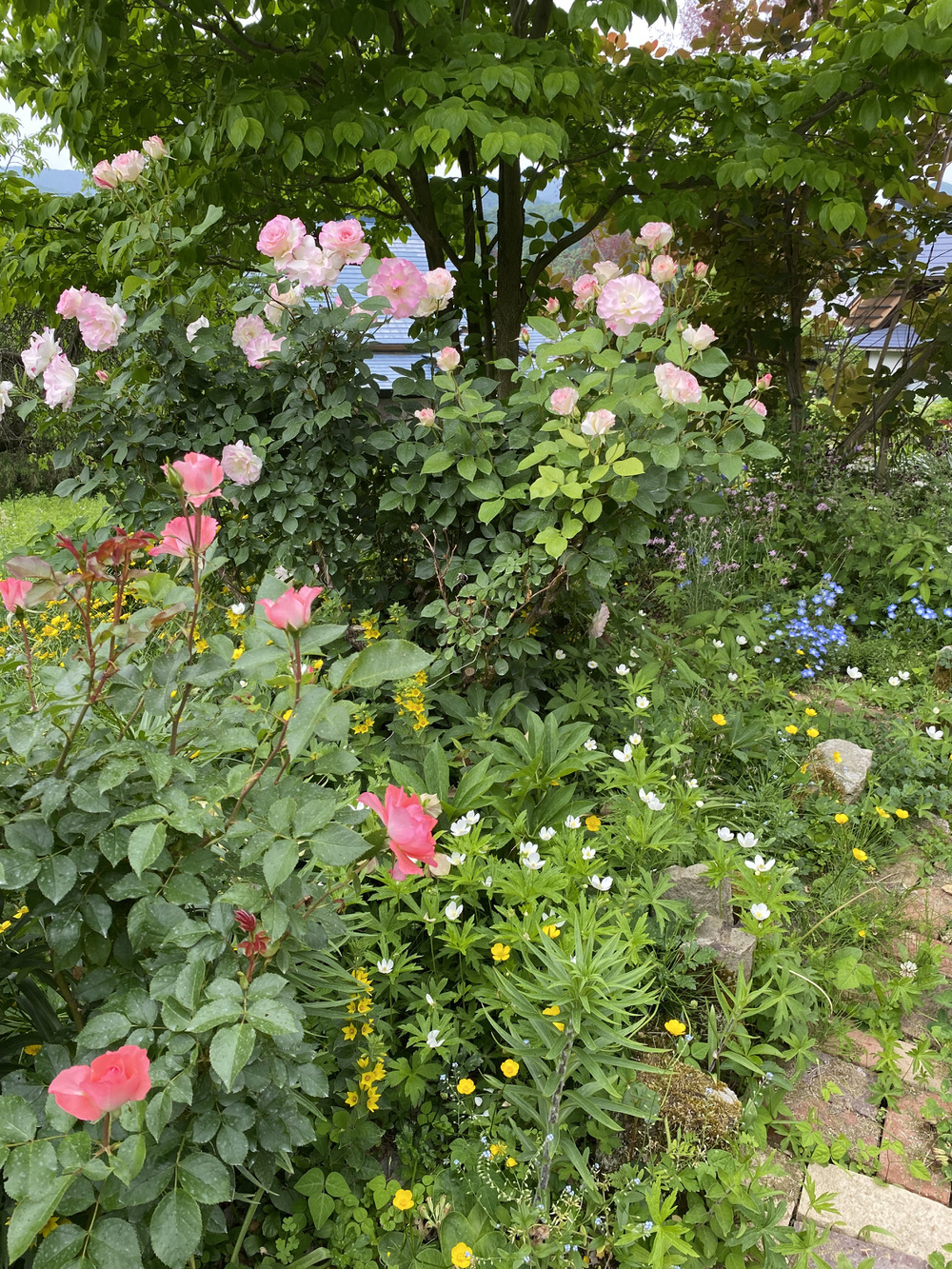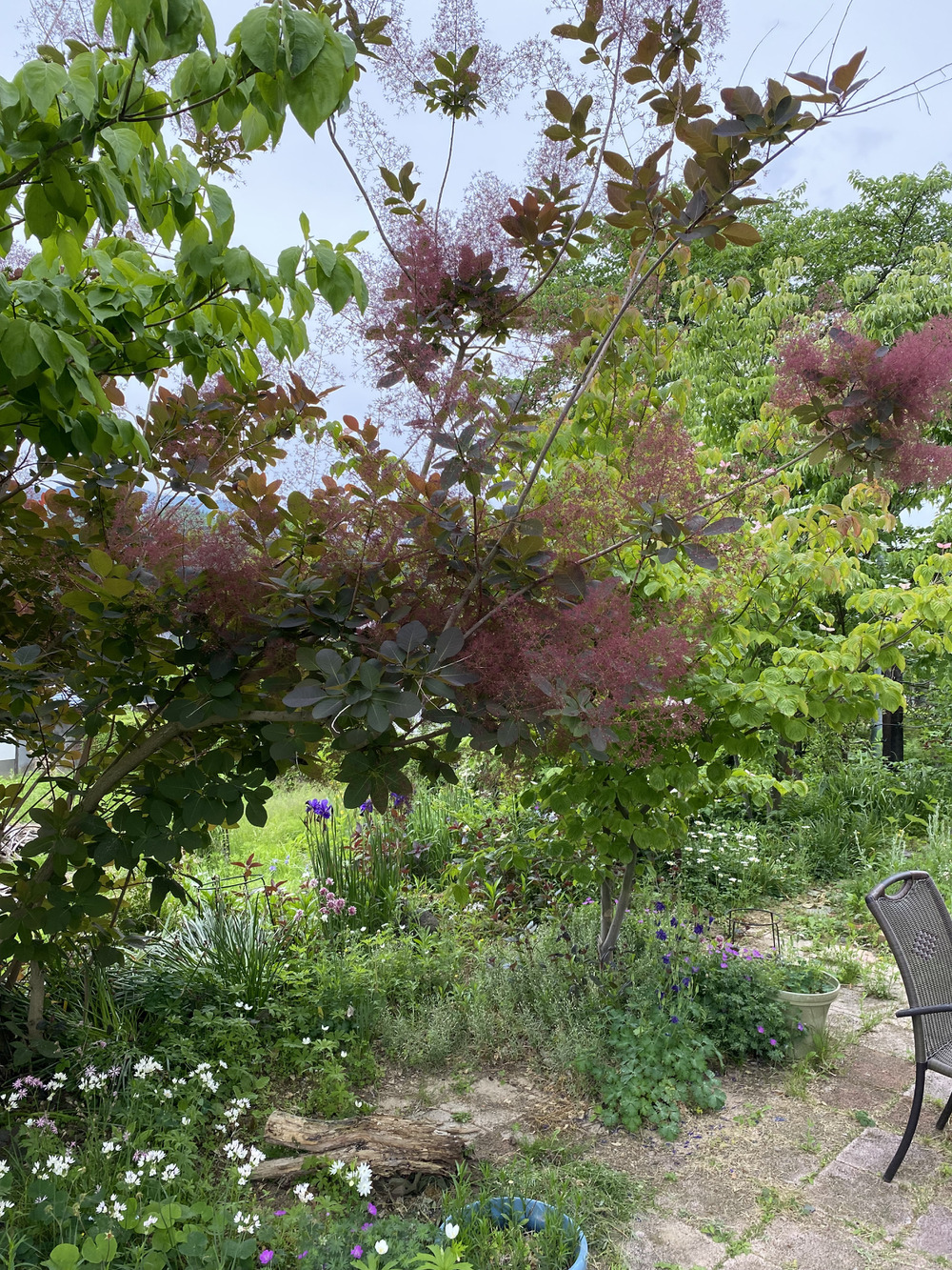 庭の薔薇が咲き始め、スモークツリーも色づいてきました。