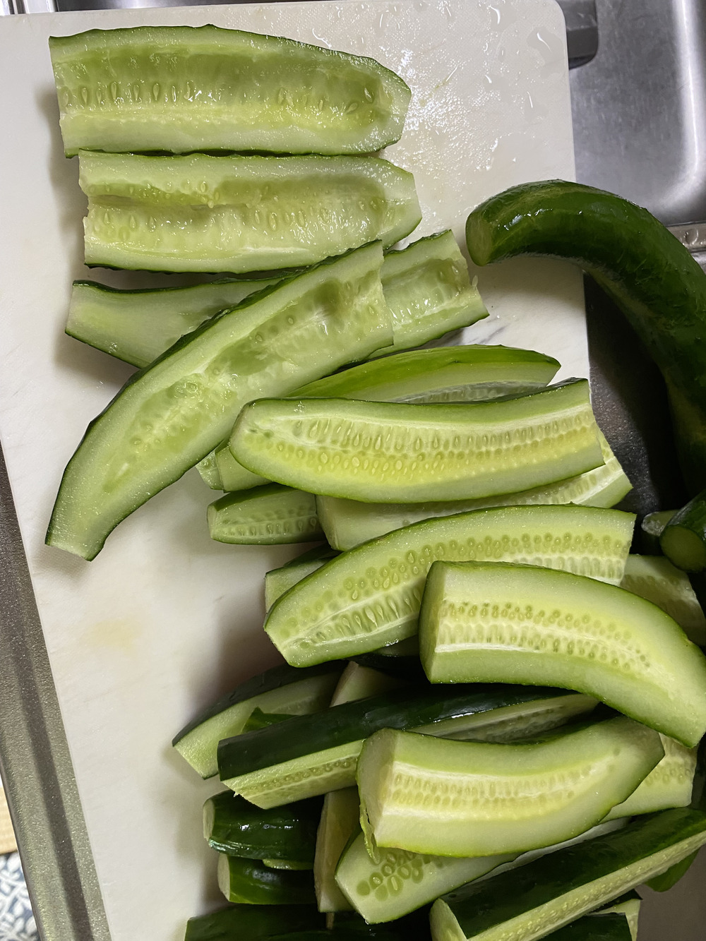 太い胡瓜は、半分にわって種をとり2.3ミリに切って塩をふる。