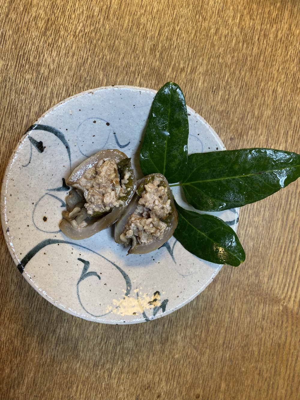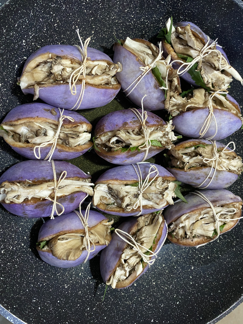 アケビの皮に、鶏ひき肉と胡桃を味噌と砂糖で味付けします。濃い目に!それをアケビの皮に詰めて舞茸で蓋をしてタコイトで結んで油で蒸し焼きして完成です!