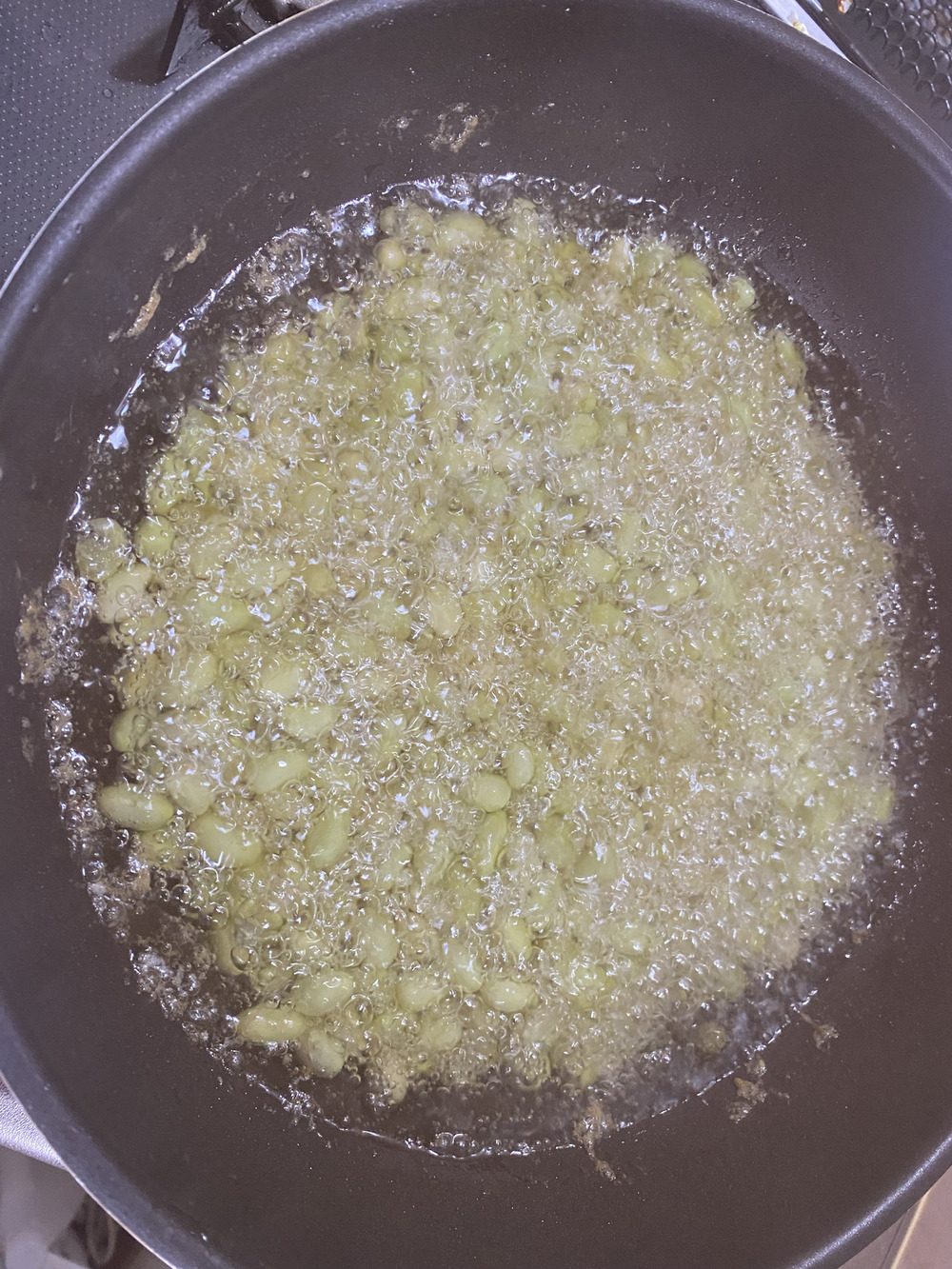 一晩水につけた大豆をよく水をきって、油で素揚げします。そのあと、砂糖と味噌、胡麻をからめて出来上がりです。ご飯のお供にも😊