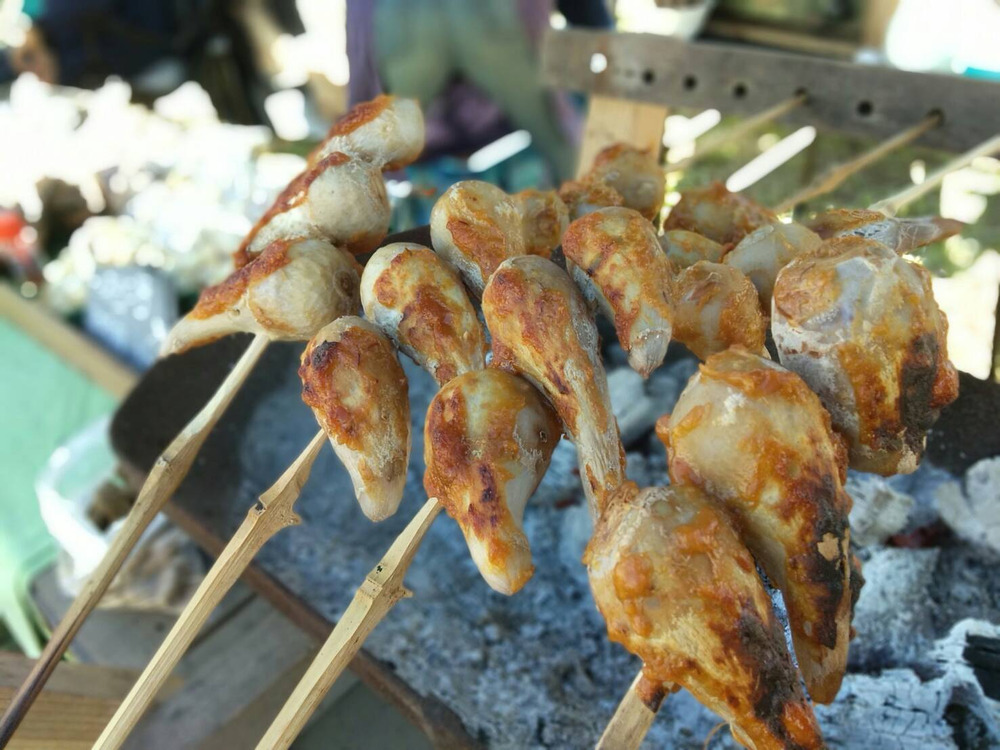 芋たんぽは、ご飯と茹でたお芋を半々の分量でマッシュして、串に付けて芋田楽と同じ様に炭火で炙ります。