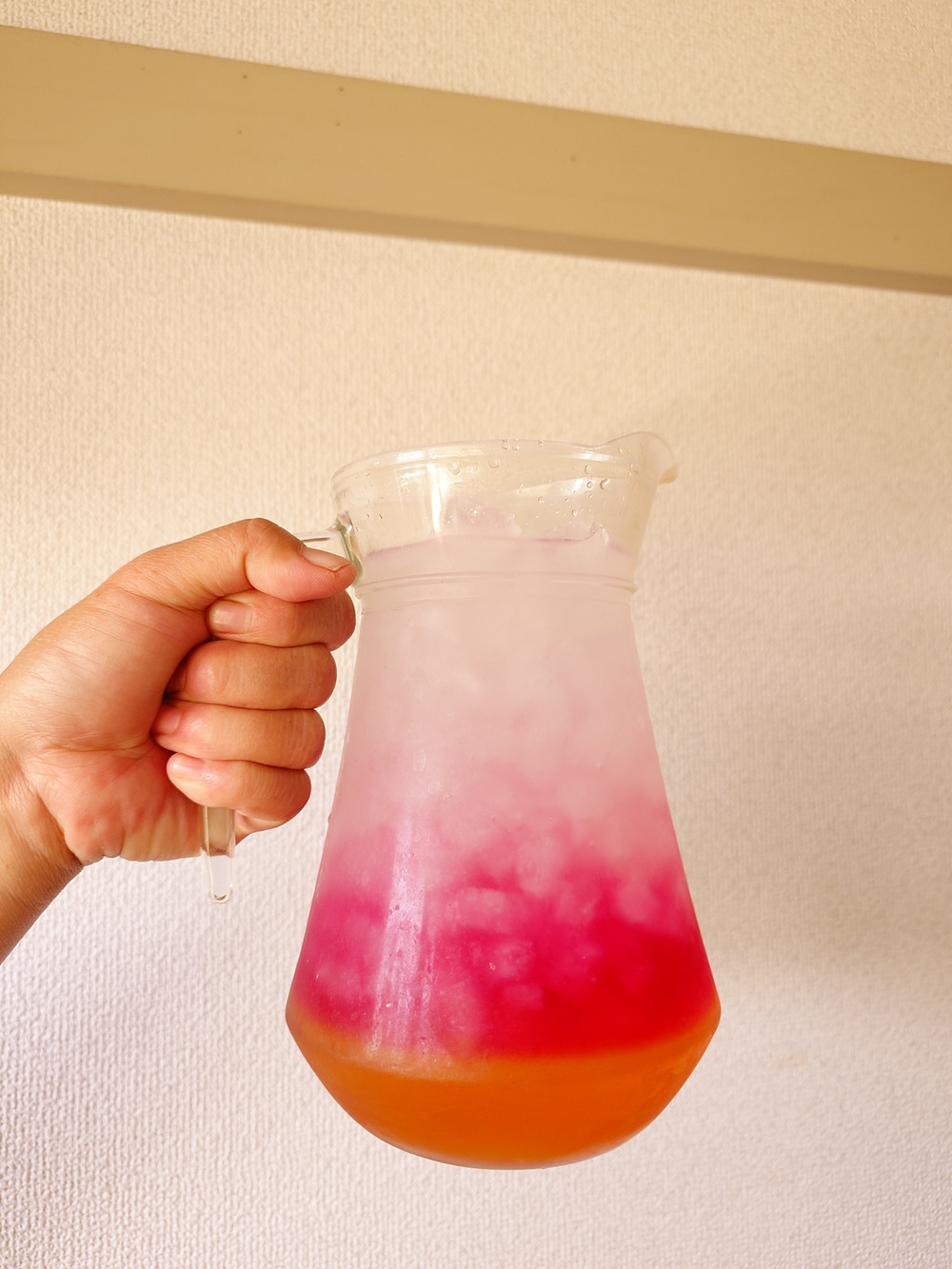 昼くらいからは、暑くて、早めの昼休みの、ジュース、赤しそと梅のジュース、