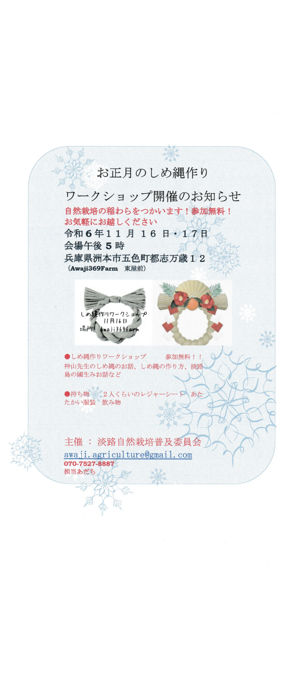 自然栽培稲わらを使用したしめ縄作りワークショップを無料開催します。
