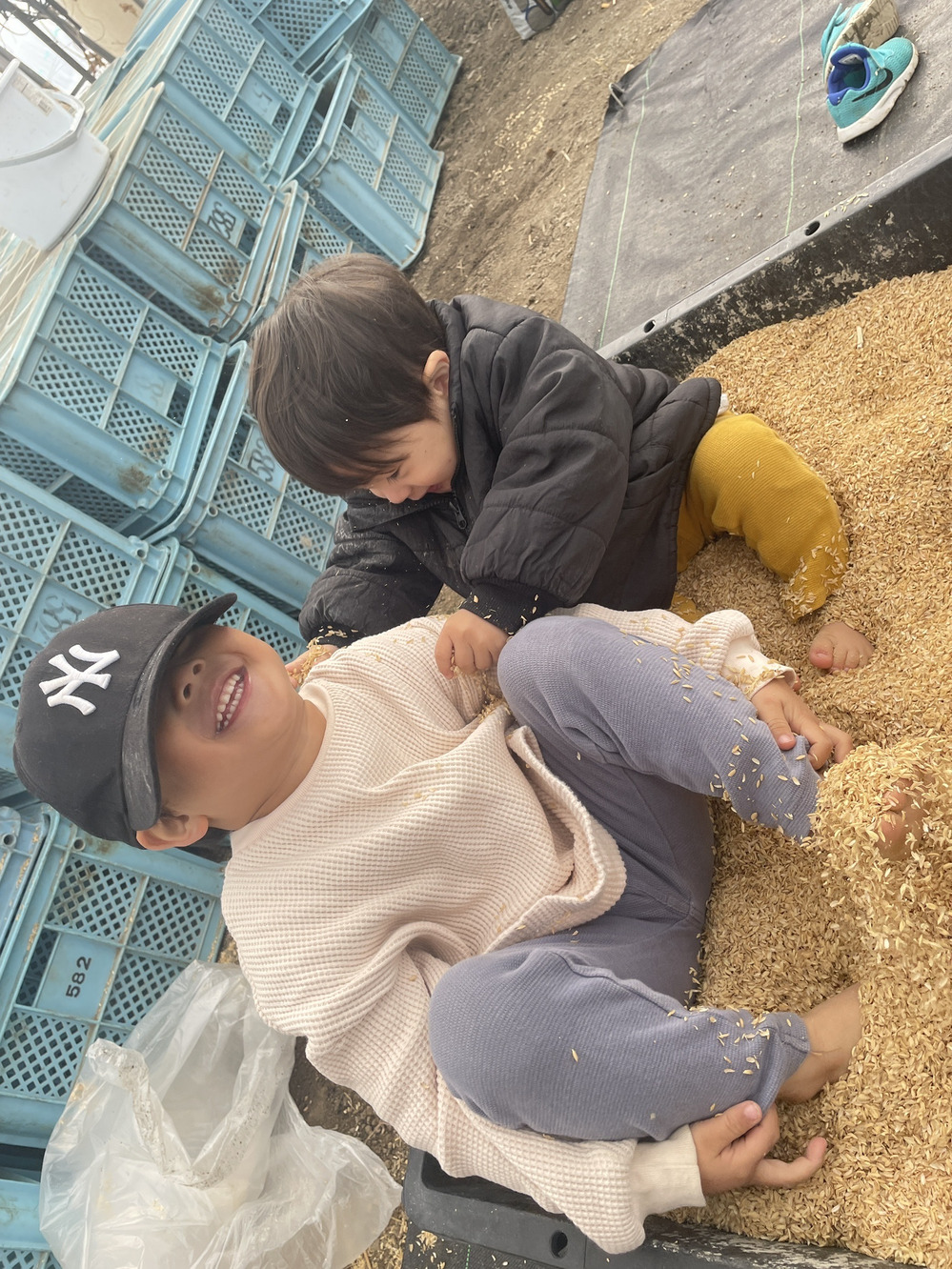籾殻のプールや育苗用のトンネルでキャンプごっこをする子供達を眺めながらの作業でした😊