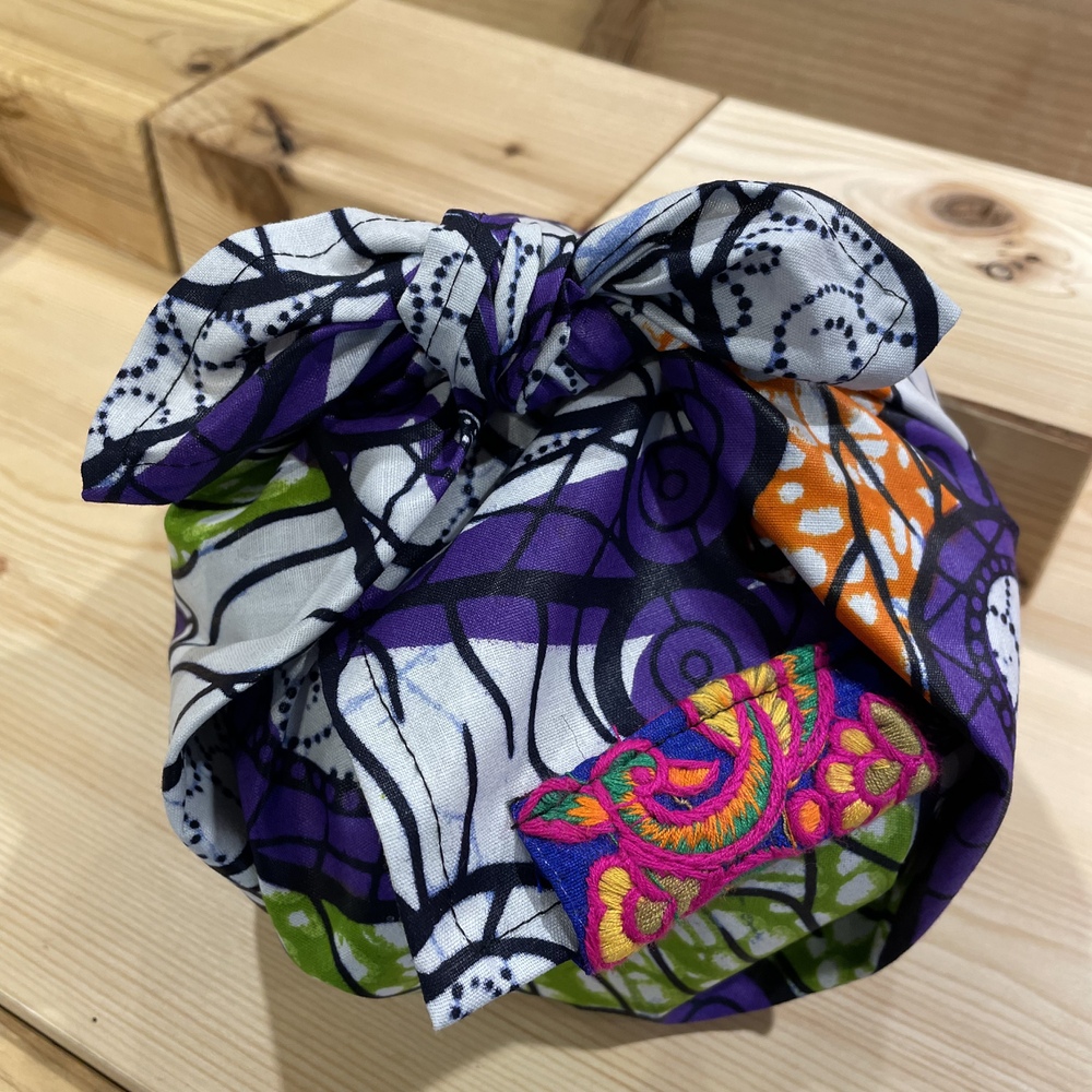 の2点の商品を、農園を一緒に運営している函館市内のエシカルブランド RomioRiのアフリカ布風呂敷でラッピング。