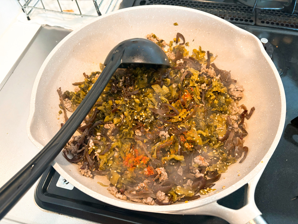 胡麻油で仁淀川きくらげと高菜の漬物を炒めるだけ