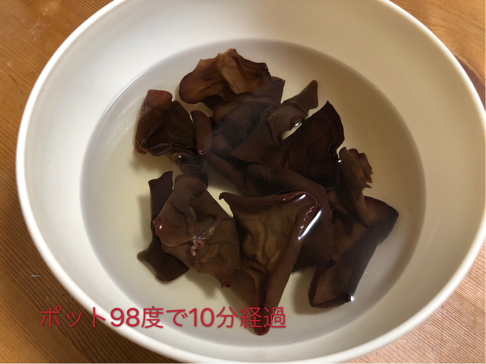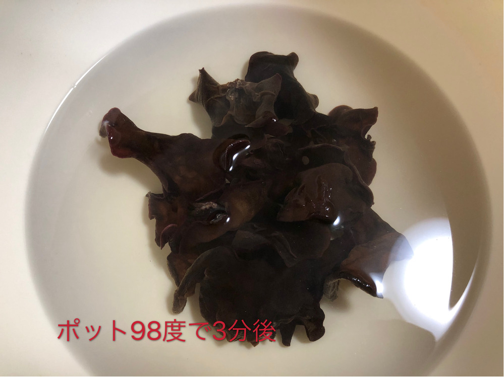 1、乾燥きくらげをボールに入れて、ポット98度のお湯をたっぷりと注ぐ♨️