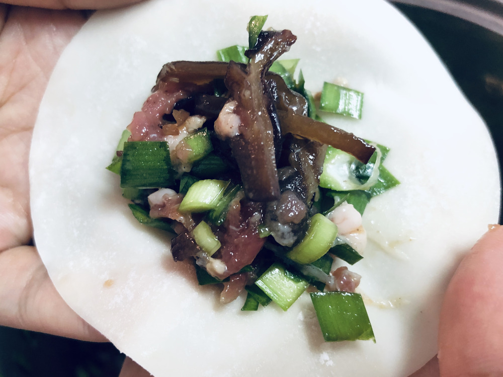 ②高知県産ニラ、戻した仁淀川きくらげを粗めに切り、肉と一緒に混ぜます。
