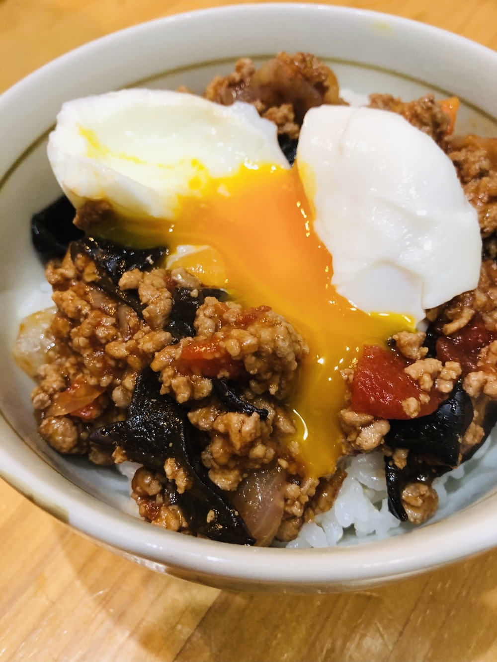 「挽肉ときくらげとピーマンのトマトケチャップ丼🍅〜半熟卵乗せ〜」