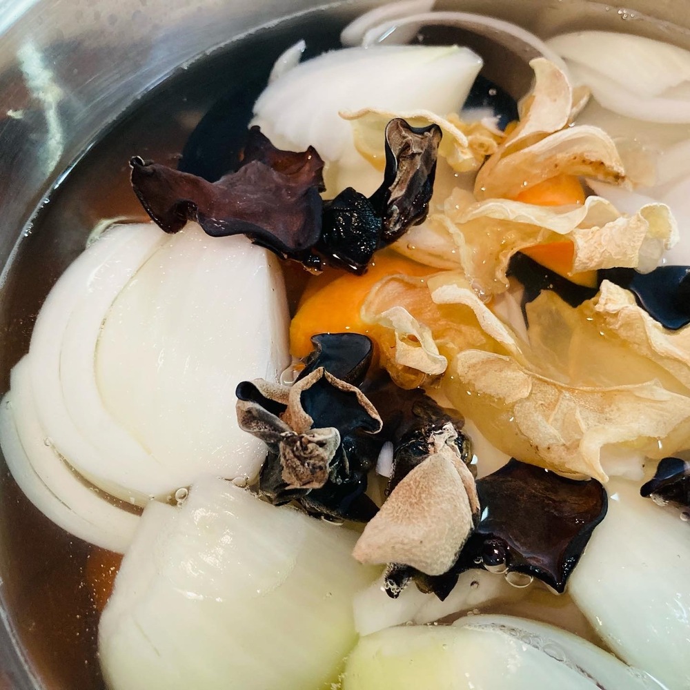 1、乾燥の仁淀川きくらげは、戻さずに乾燥のままお鍋に入れよう☝️安心の無農薬、洗浄済み。