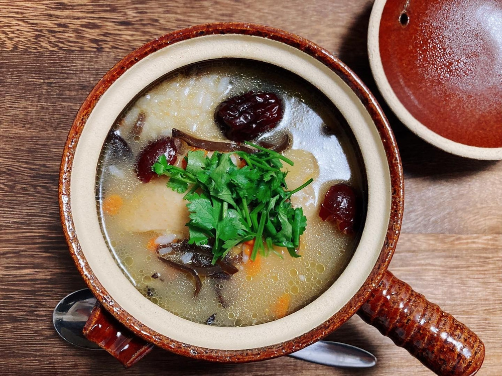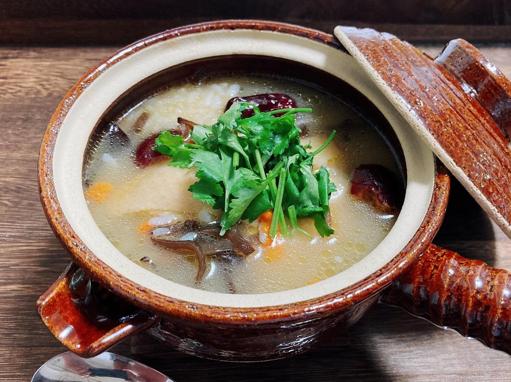 ☝️お鍋でコトコト炊いた手羽先から出る美味しいお出汁🍲と、きくらげのコリコリした食感🍄、棗や枸杞の自然の甘みがたっぷり詰まったお粥です🥢😊