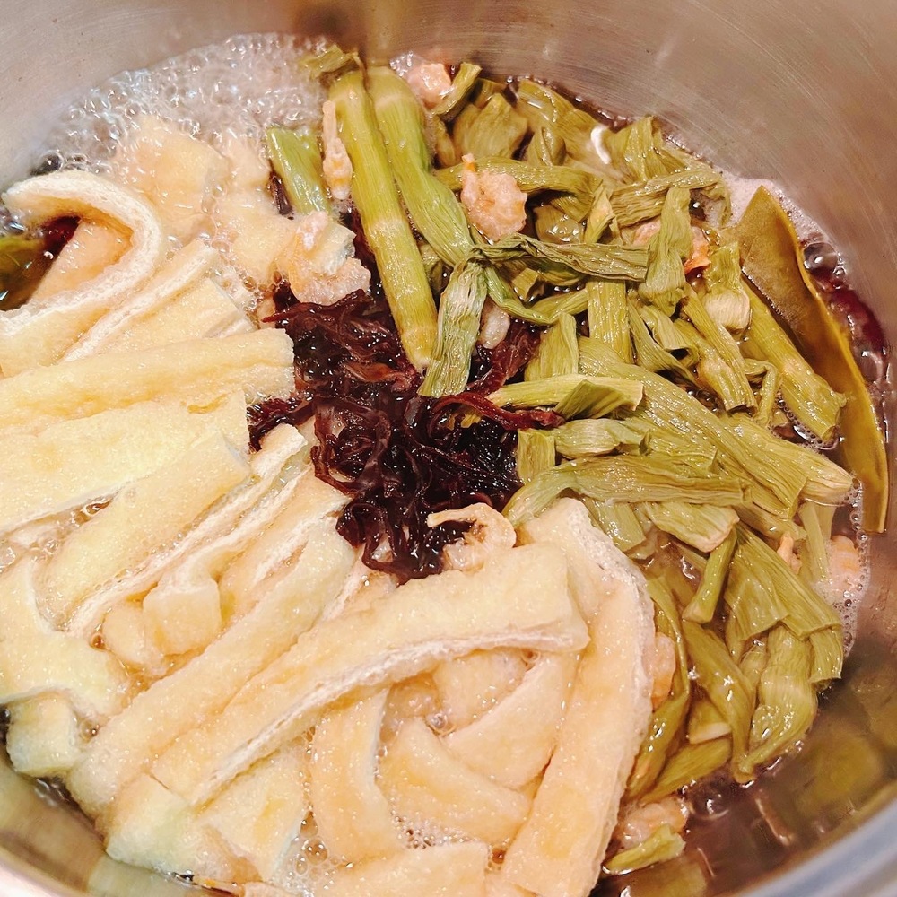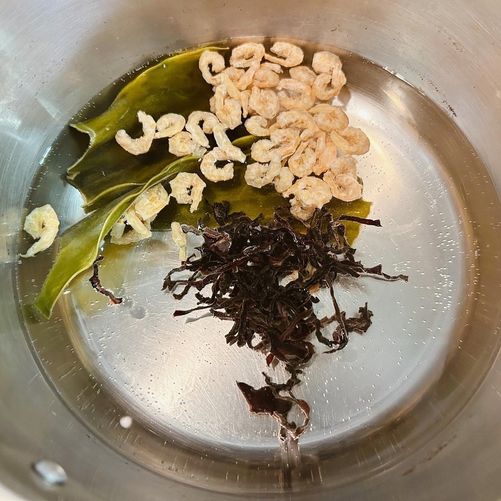 1、鍋に干し海老と昆布、乾燥きくらげスライスタイプを入れてコトコト旨み出汁をとります🥘