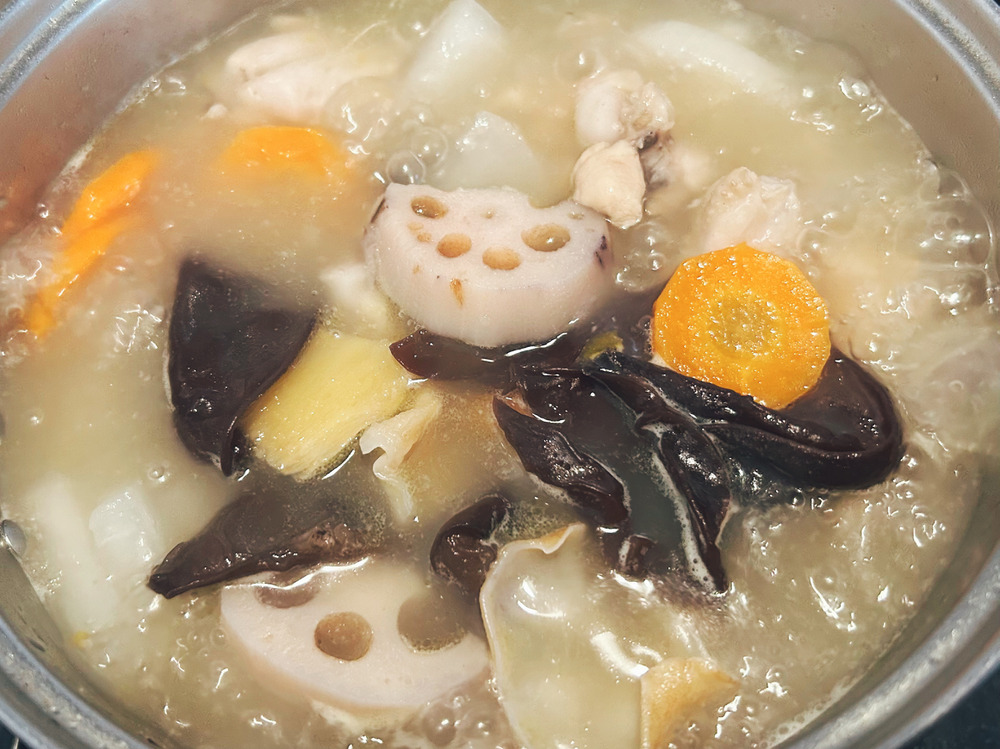 仁淀川きくらげと根菜、手羽元をコトコト炊いて🍲濃厚、きくらげぷりぷりの美味しいスープできました☺️