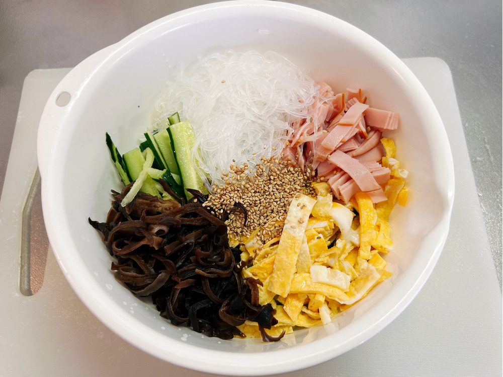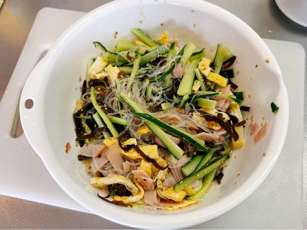 ①湯がいた春雨、きくらげ、薄く焼いて切った卵焼き、ハム、胡麻、胡瓜🥒をボールに入れる