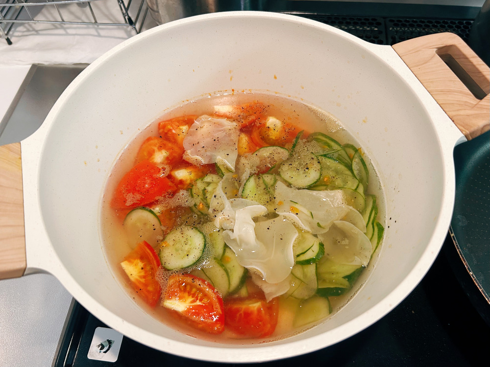 ①お鍋に、きくらげ、薄切りにした胡瓜、トマトを入れて炊く。コンソメ、鶏ガラスープ、塩胡椒を入れてお好みで味を調節してください☺️