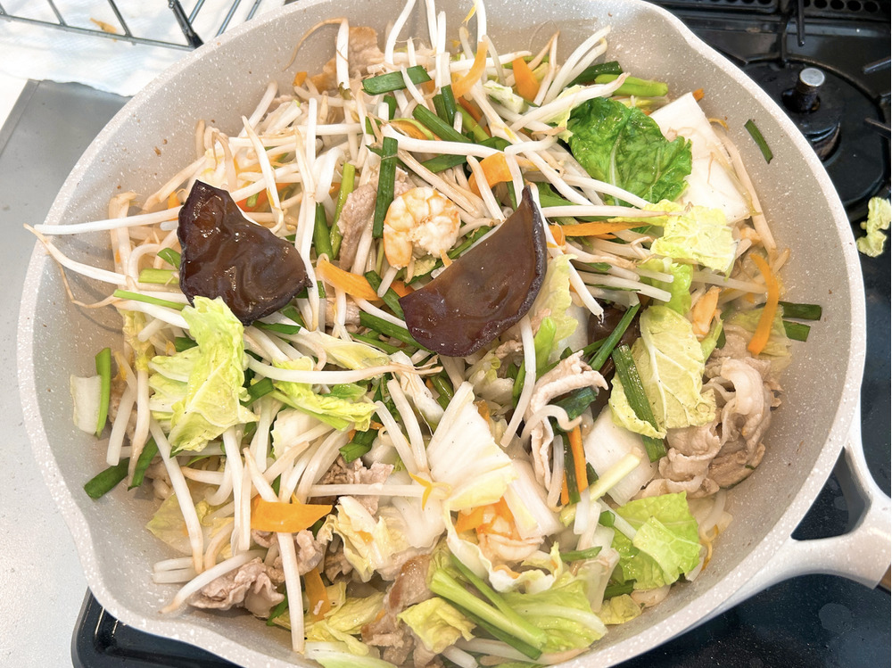 ①豚バラ、海老、生きくらげ、簡単野菜、ウズラ卵の順番で炒めます。