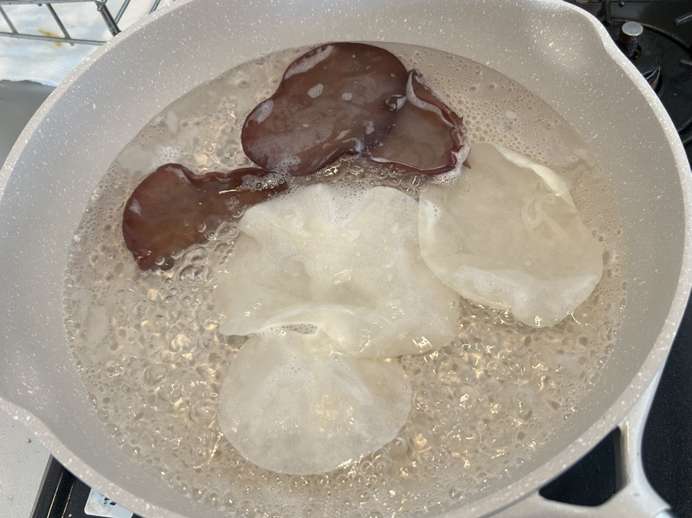 ①生きくらげを水洗いして2-3分ゆがく♨️