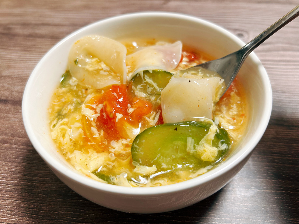 ①お鍋に、きくらげ、薄切りにした胡瓜、トマトを入れて炊く。コンソメ、鶏ガラスープ、塩胡椒を入れてお好みで味を調節してください☺️