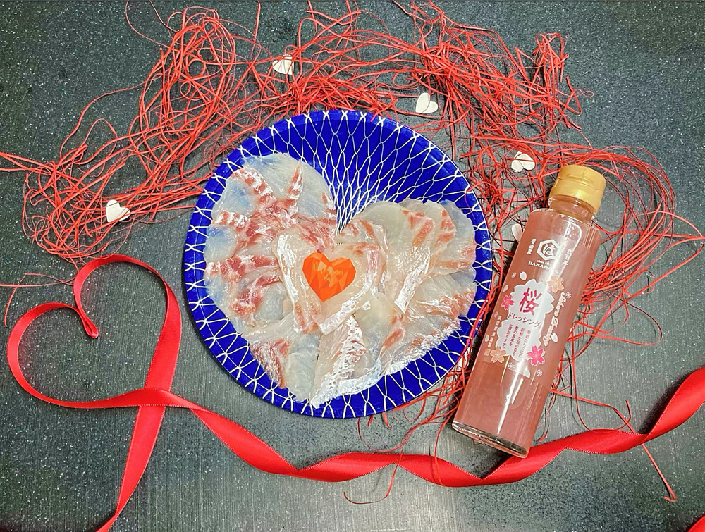 まもなく【桃の節句】もありますので、ピンクのドレッシング付き真鯛の❤️型お刺身でお祝いしませんか⁉️