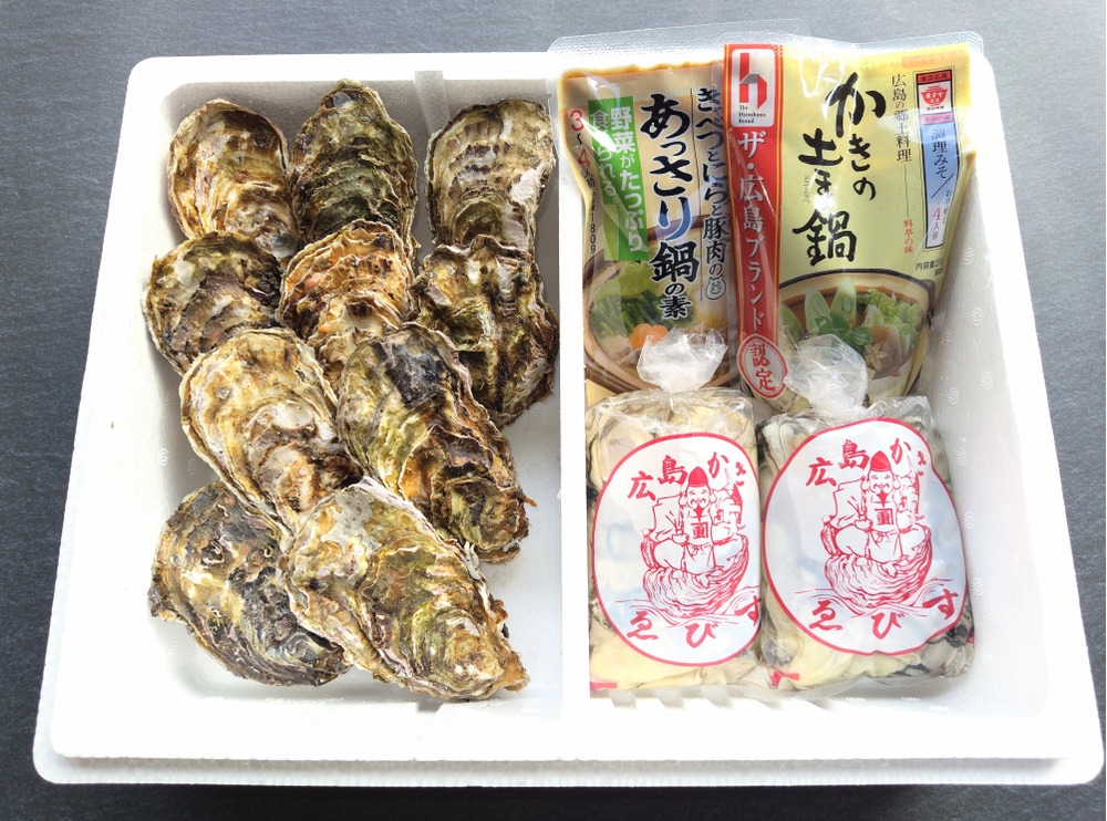 ②殻付き牡蠣10ヶ,むき身300g×2袋,選べる鍋のもと2ヶ