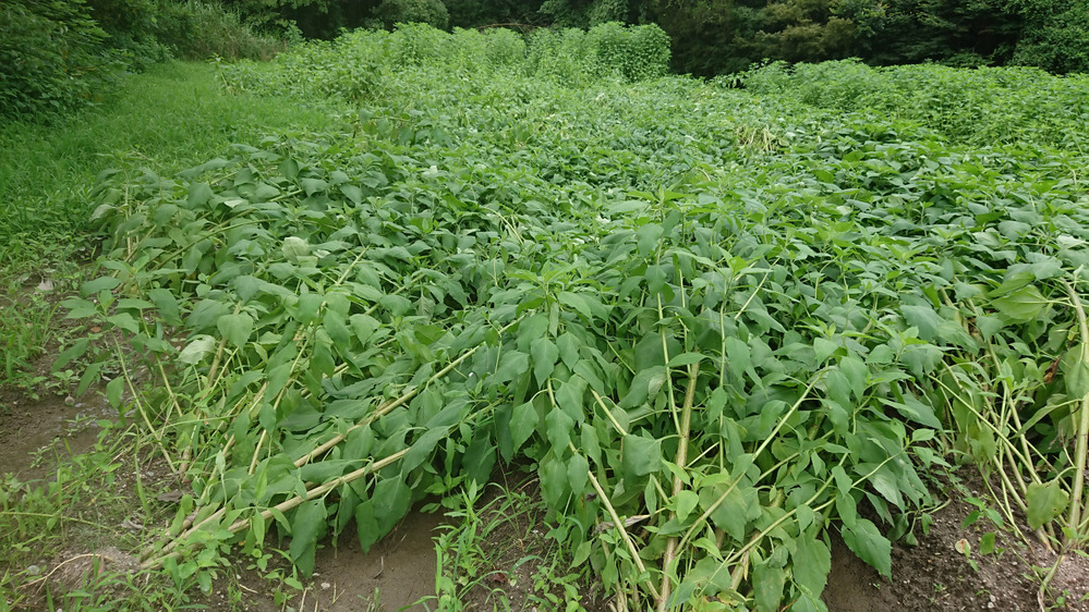 6月30日、梅雨の晴れ間に除草作業を終えたばかりのキクイモ畑(画像左)ですが、7月に入った途端による滝のような大粒の大雨により、見るも無残にキクイモがなぎ倒されてしまいました。(画像右)