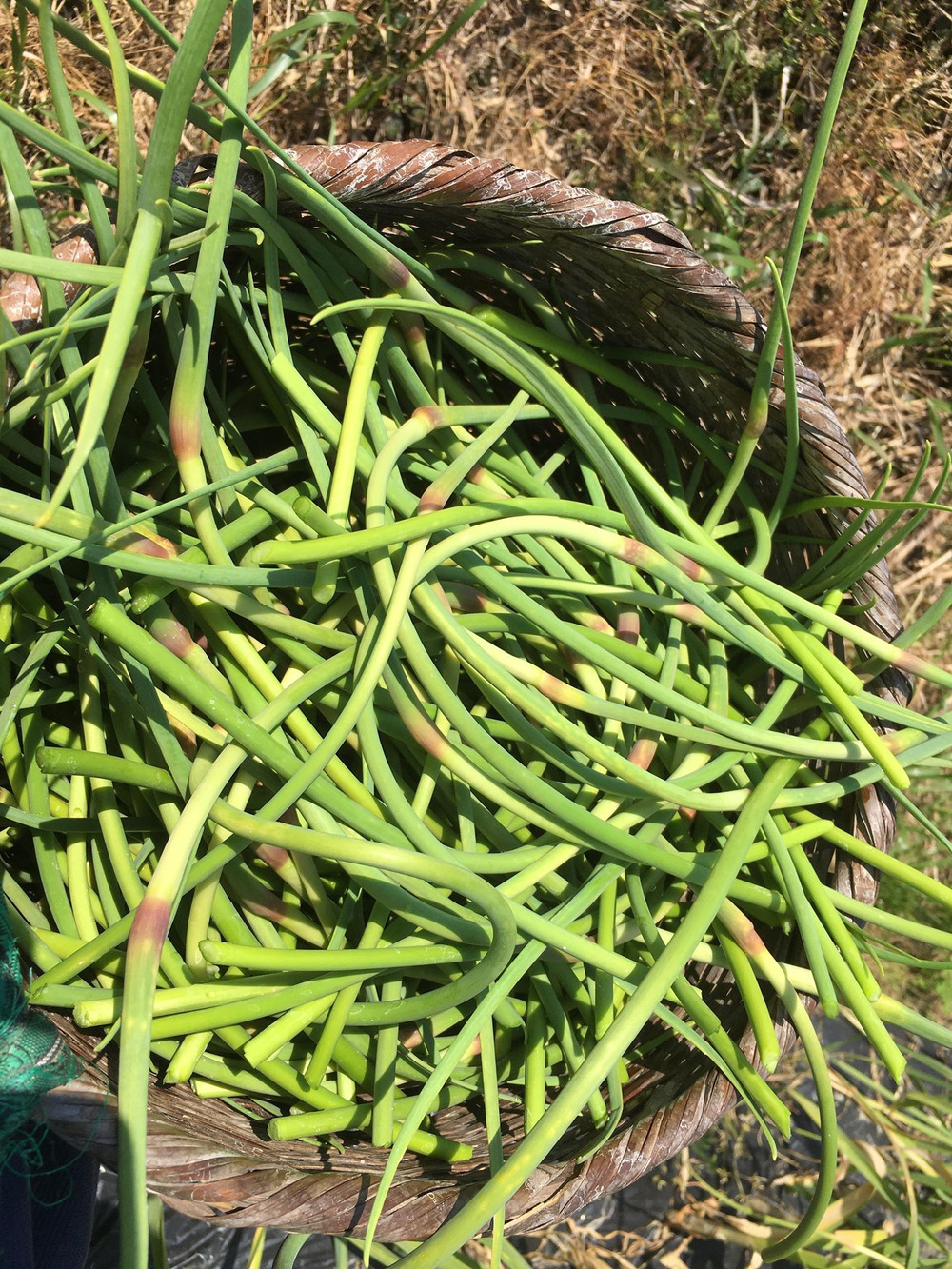 にんにくの芽の出荷始まりました!毎日あっという間にのびるので、のびすぎないように気をつけながら摘み取っています。今しか味わえない旬の味覚、ご賞味ください!フリーザーバッグに入れて冷凍保存だと半年以上は日持ちします。