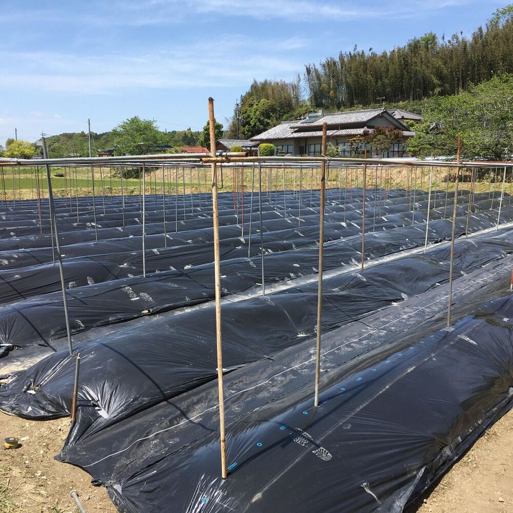 忙しい💦アピオスの畝に支柱が立ちました!これからマルチに穴を開けて植え付けしていきます。