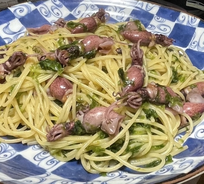 オリーブオイル、ニンニク、出汁醤油などで味付け、