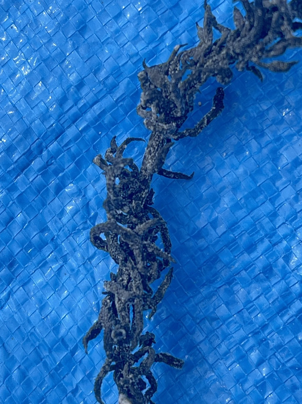 先日に投稿した(刈りたてヒジキ)を干すと、カラカラになってこんな小さくなります。白くなってるのは塩分やミネラル分です。