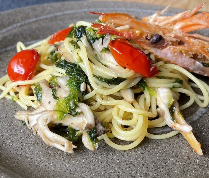 アヒージョの残り汁をぜーんぶ吸わせた、あおさパスタ。