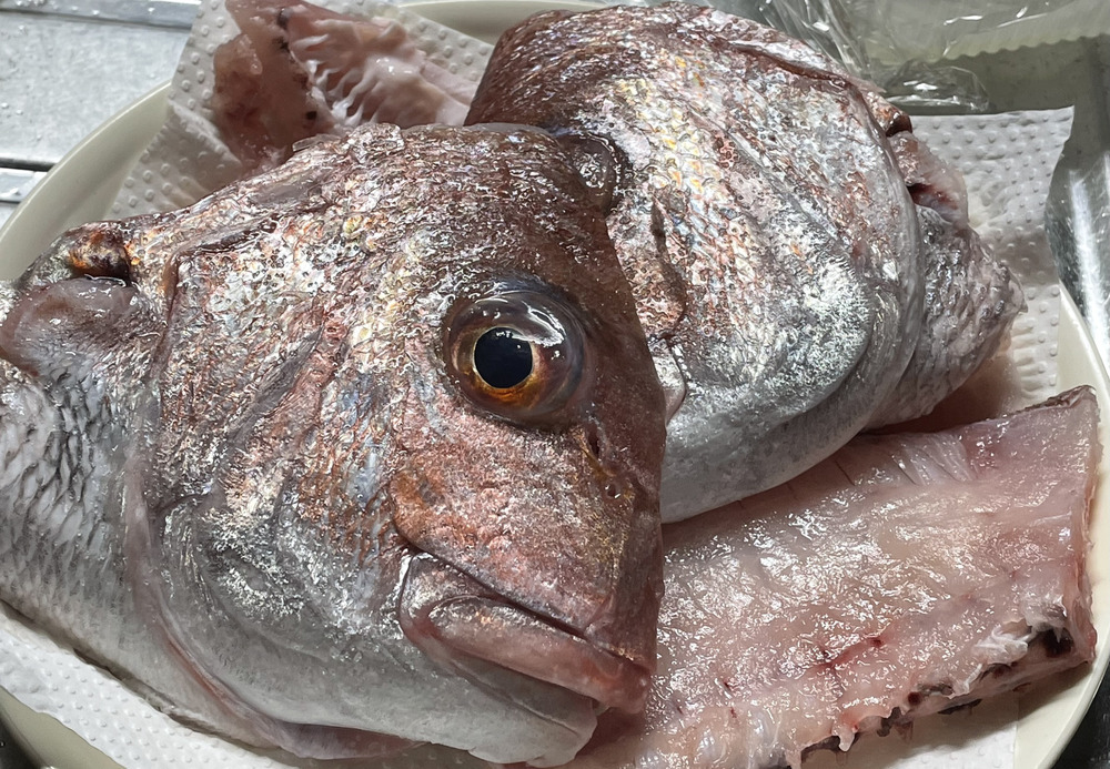 スーパーで目が合った優しい目の天然鯛を買いました。鯛飯にしてレンチンアオサを振ります。