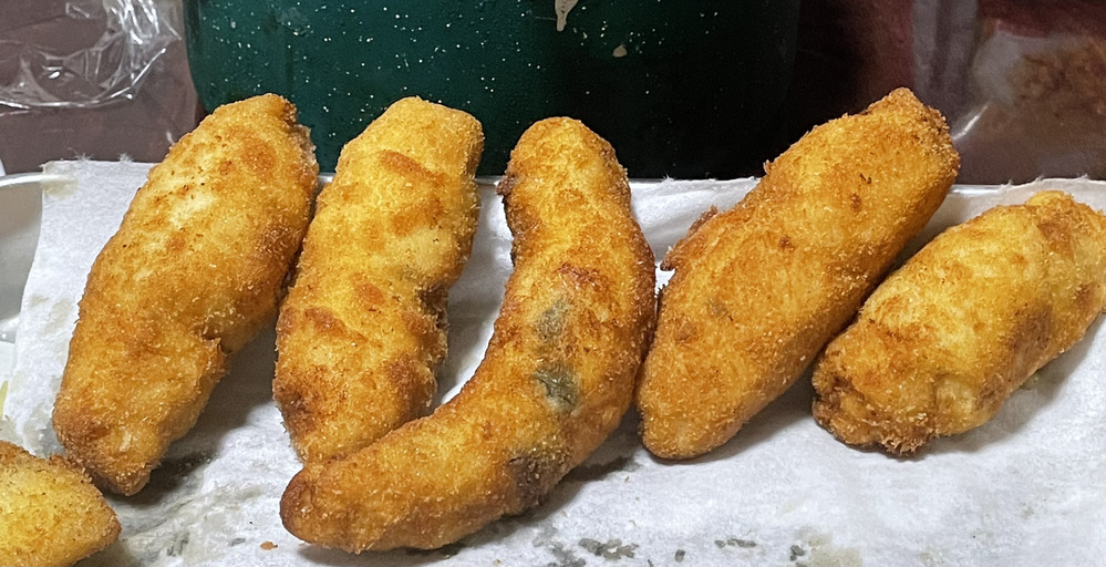 ②梅肉と合わせたやつと、チーズと合わせたやつ。ササミフライ。中に巻いて直接に油と触れてないので、ちゃんと風味も残る。めちゃ見た目悪いけどめちゃ美味しい。